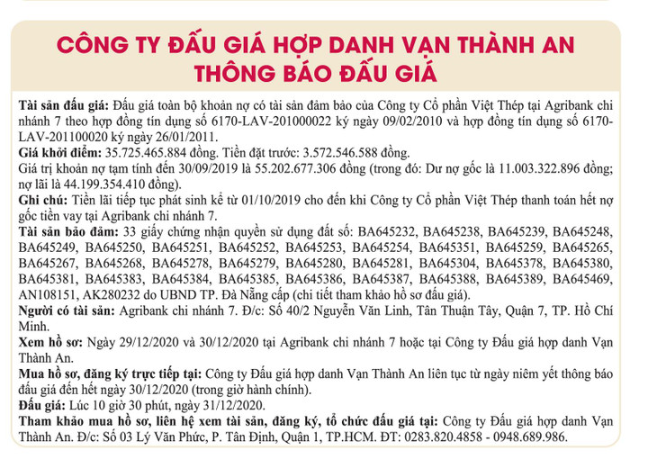 Ngày 31/12/2020, đấu giá toàn bộ khoản nợ của Công ty CP Việt Thép tại Agribank Chi nhánh 7