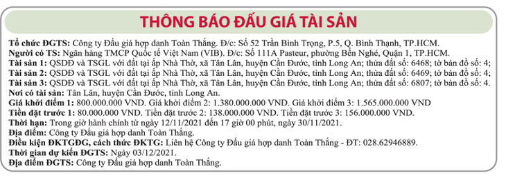 (BĐT) - Công ty Đấu giá hợp danh Toàn Thắng thông báo đấu giá tài sản vào ngày 3/12/2021 do Ngân hàng TMCP Quốc tế Việt Nam (VIB) ủy quyền như sau: