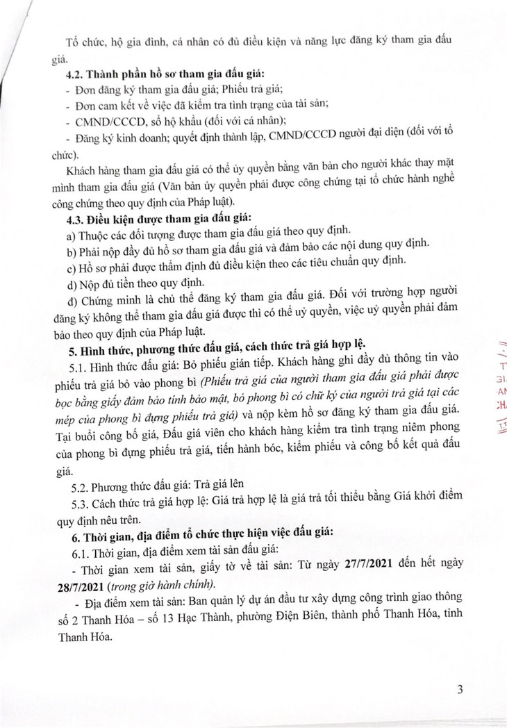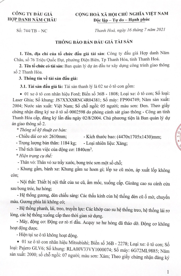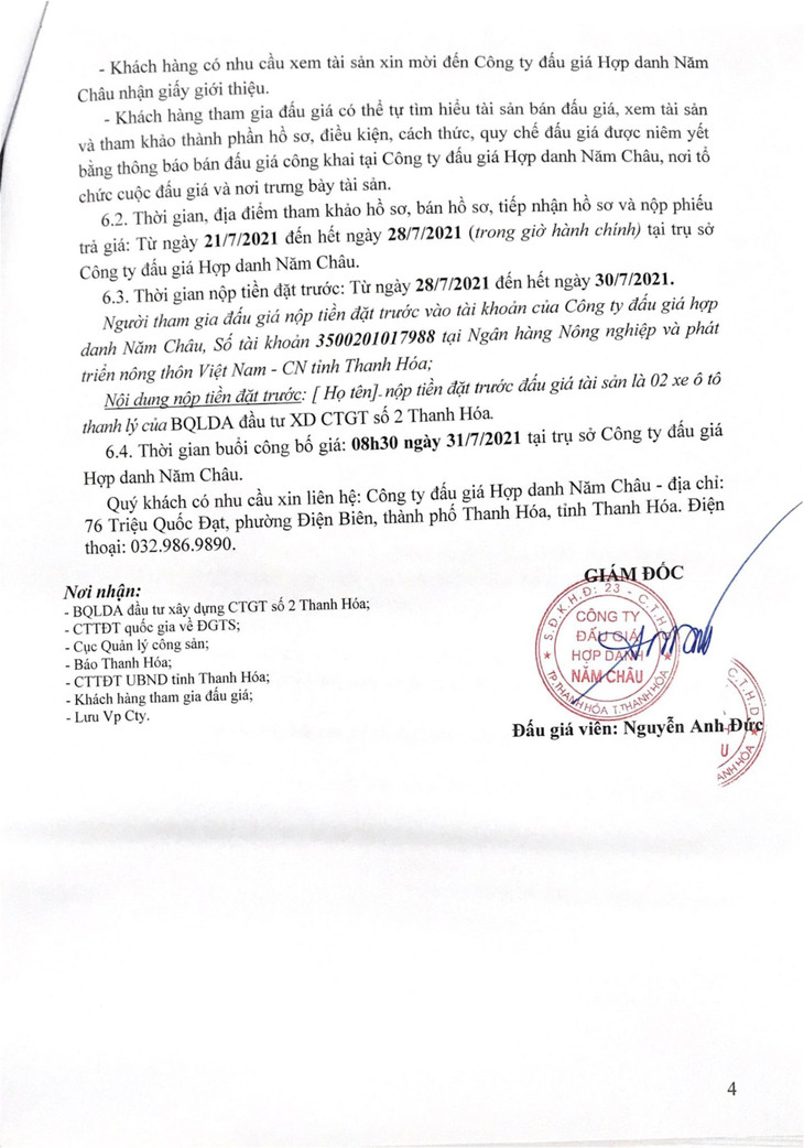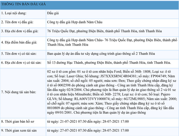 (BĐT) - Công ty Đấu giá hợp danh Năm Châu thông báo đấu giá tài sản vào ngày 31/7/2021 do Ban quản lý dự án đầu tư xây dựng công trình giao thông số 2 Thanh Hóa ủy quyền như sau: