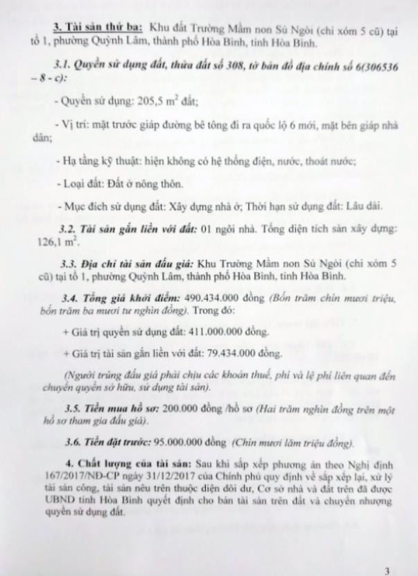 2. Tài sản thứ hai: Khu đất Trường Mầm non Sủ Ngòi (chi xóm 2 cũ) tại tổ 2, phường Quỳnh Lâm, thành phố Hòa Bình, tỉnh Hòa Bình, diện tích: 58,5m2, giá khởi điểm: 134.550.000 đồng. 3. Tài sản thứ 3: Khu đất Trường Mầm non Sủ ngòi (chi xóm 5 cũ) tại tổ 1, phường Quỳnh Lâm, thành phố Hòa Bình, tỉnh Hòa Bình, diện tích: 205,5m2, giá khởi điểm: 490.434.000 đồng.