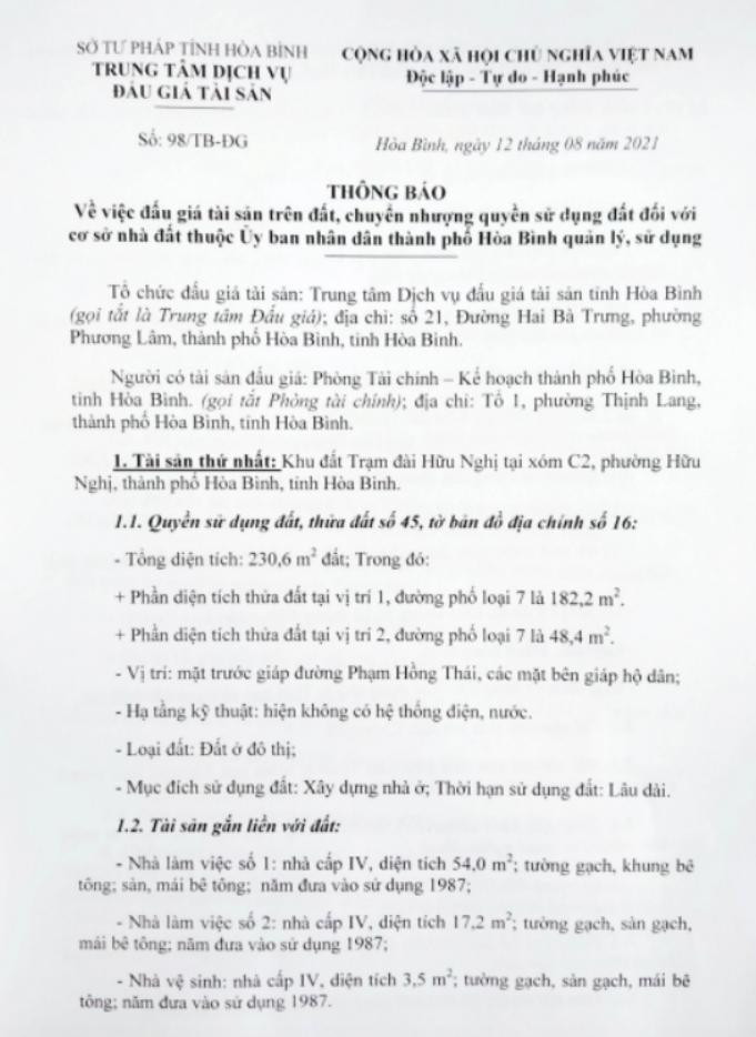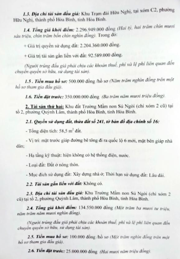 1. Tài sản thứ nhất: Khu đất Trạm đài Hữu Nghị tại xóm C2, phường Hữu Nghị, thành phố Hòa bình, tỉnh Hòa Bình, diện tích: 230,06m2, giá khởi điểm: 2.296.949.000 đồng.