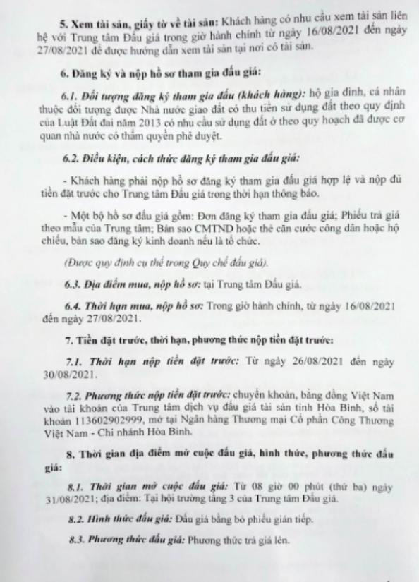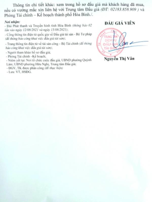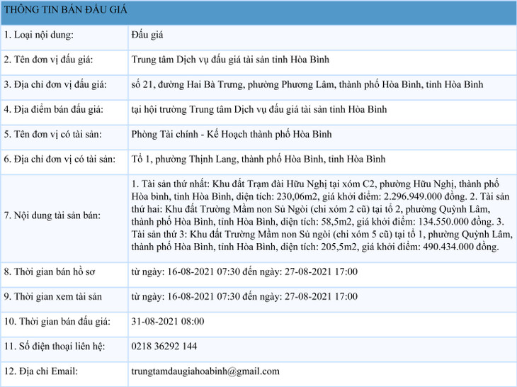 (BĐT) - Trung tâm Dịch vụ đấu giá tài sản tỉnh Hòa Bình thông báo đấu giá tài sản vào ngày 31/8/2021 do Phòng Tài chính - Kế hoạch thành phố Hòa Bình ủy quyền như sau: