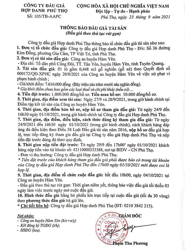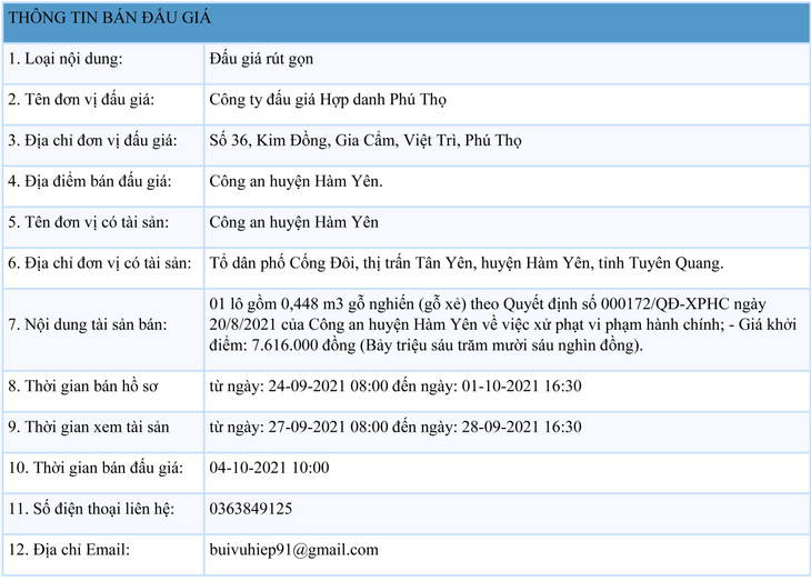 01 lô gồm 0,448 m3 gỗ nghiến (gỗ xẻ) theo Quyết định số 000172/QĐ-XPHC ngày 20/8/2021 của Công an huyện Hàm Yên về việc xử phạt vi phạm hành chính; - Giá khởi điểm: 7.616.000 đồng (Bảy triệu sáu trăm mười sáu nghìn đồng).