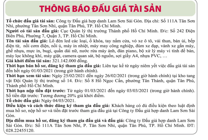 (BĐT) - Công ty Đấu giá hợp danh Lam Sơn Sài Gòn thông báo đấu giá tài sản vào ngày 4/3/2021 do Cục Quản lý thị trường TPHCM ủy quyền như sau: