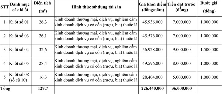 II. MỨC GIÁ KHỞI ĐIỂM, BƯỚC GIÁ, TIỀN ĐẶT TRƯỚC ĐỂ ĐẤU GIÁ CHO THUÊ MẶT BẰNG KINH DOANH: