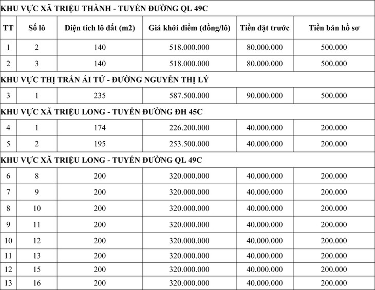 PHỤ LỤC GIÁ KHỞI ĐIỂM, SỐ TIỀN ĐẶT TRƯỚC VÀ TIỀN BÁN HỒ SƠ CÁC LÔ ĐẤT THUỘC XÃ TRIỆU THÀNH, XÃ TRIỆU LONG, THỊ TRẤN ÁI TỬ, HUYỆN TRIỆU PHONG, TỈNH QUẢNG TRỊ DO BAN QUẢN LÝ DỰ ÁN ĐẦU TƯ XÂY DỰNG VÀ PHÁT TRIỂN QUỸ ĐẤT HUYỆN TRIỆU PHONG QUẢN LÝ