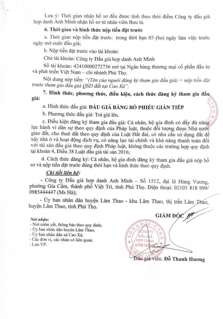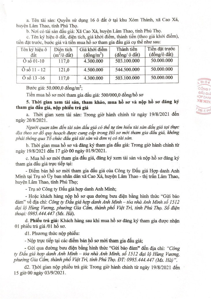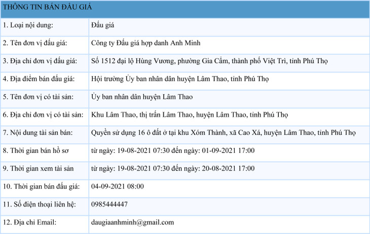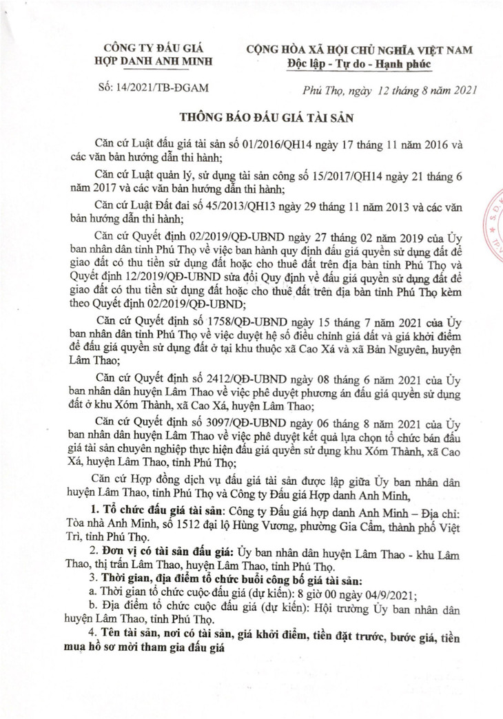 (BĐT) - Công ty Đấu giá hợp danh Anh Minh thông báo đấu giá tài sản vào ngày 4/9/2021 do UBND huyện Lâm Thao ủy quyền như sau:
