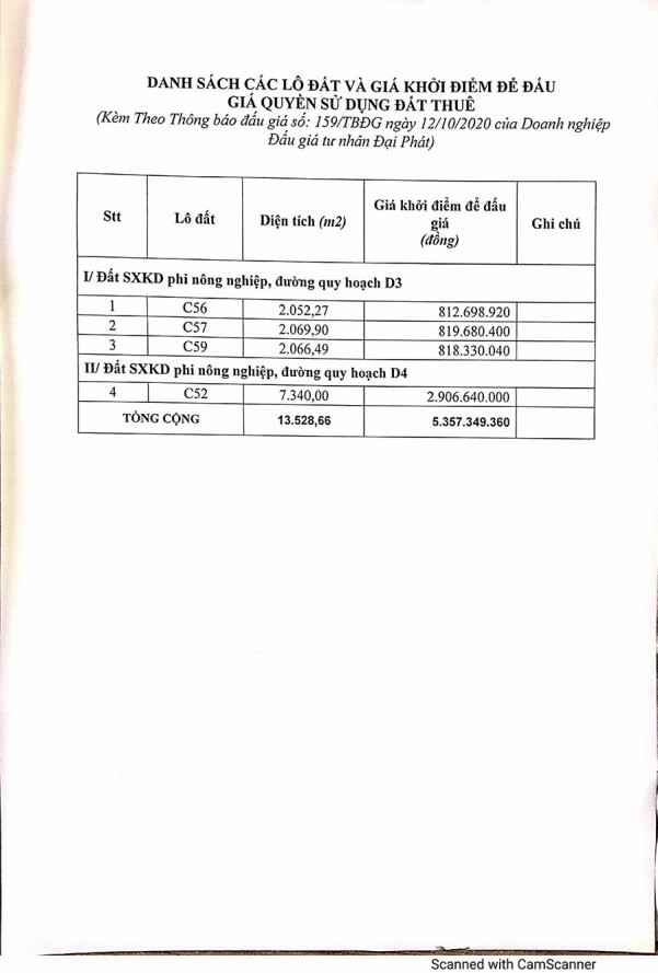 Tên tài sản đấu giá: Đấu giá cho thuê 04 lô đất sản xuất kinh doanh phi nông nghiệp, thời hạn sử dụng 50 năm: