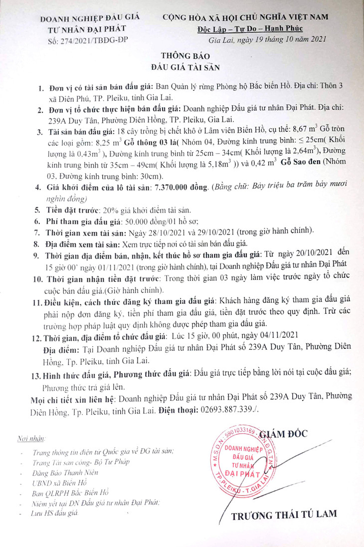 18 cây trồng bị chết khô ở Lâm viên Biển Hồ, cụ thể: 8,67 m3 Gỗ tròn các loại gồm: 8,25 m3 Gỗ thông 03 lá (Nhóm 04, Đường kính trung bình: ≤ 25cm (Khối lượng là 0,43m3), Đường kính trung bình từ 25cm – 34cm (Khối lượng là 2,64m3), Đường kính trung bình từ 35cm – 49cm (Khối lượng là 5,18m3) và 0,42 m3 Gỗ Sao đen (Nhóm 03, Đường kính trung bình: 30cm).