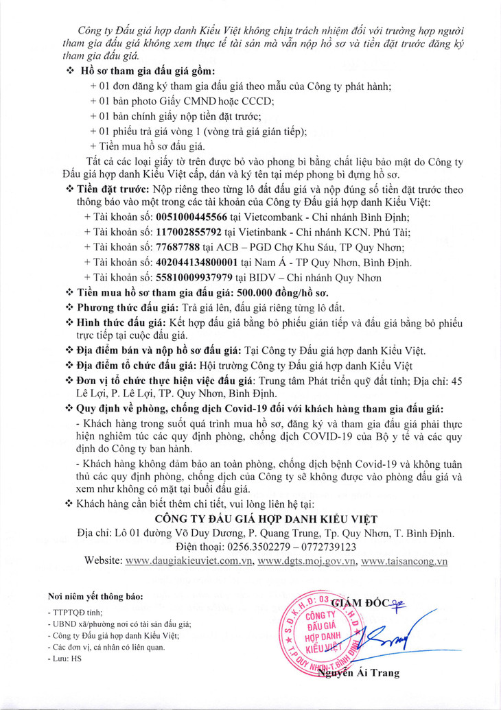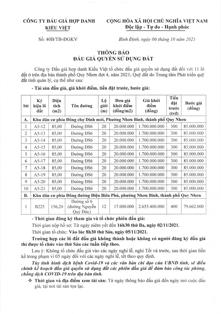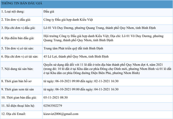 Quyền sử dụng đất đối với 11 lô đất ở trên địa bàn thành phố Quy Nhơn đợt 4, năm 2021 (trong đó: 10 lô đất ở tại Khu dân cư phía Đông chợ Dinh mới, phường Nhơn Bình và 01 lô đất ở tại Khu dân cư phía Đông đường Điện Biên Phủ, phường Nhơn Bình)