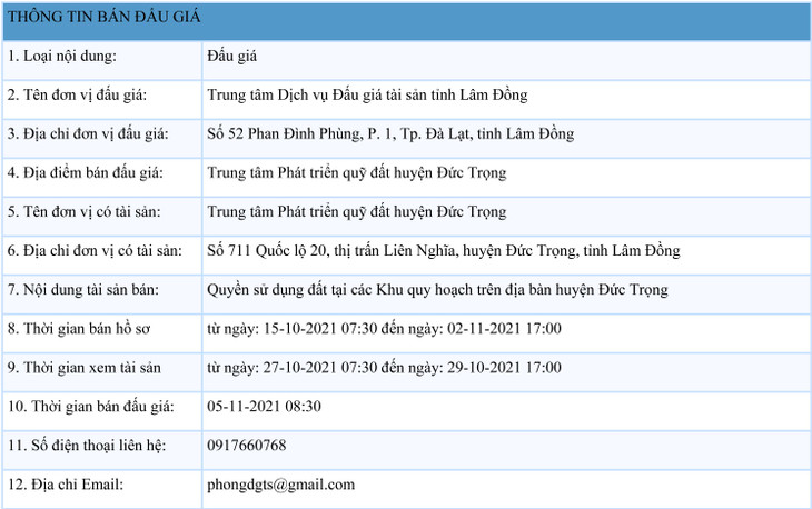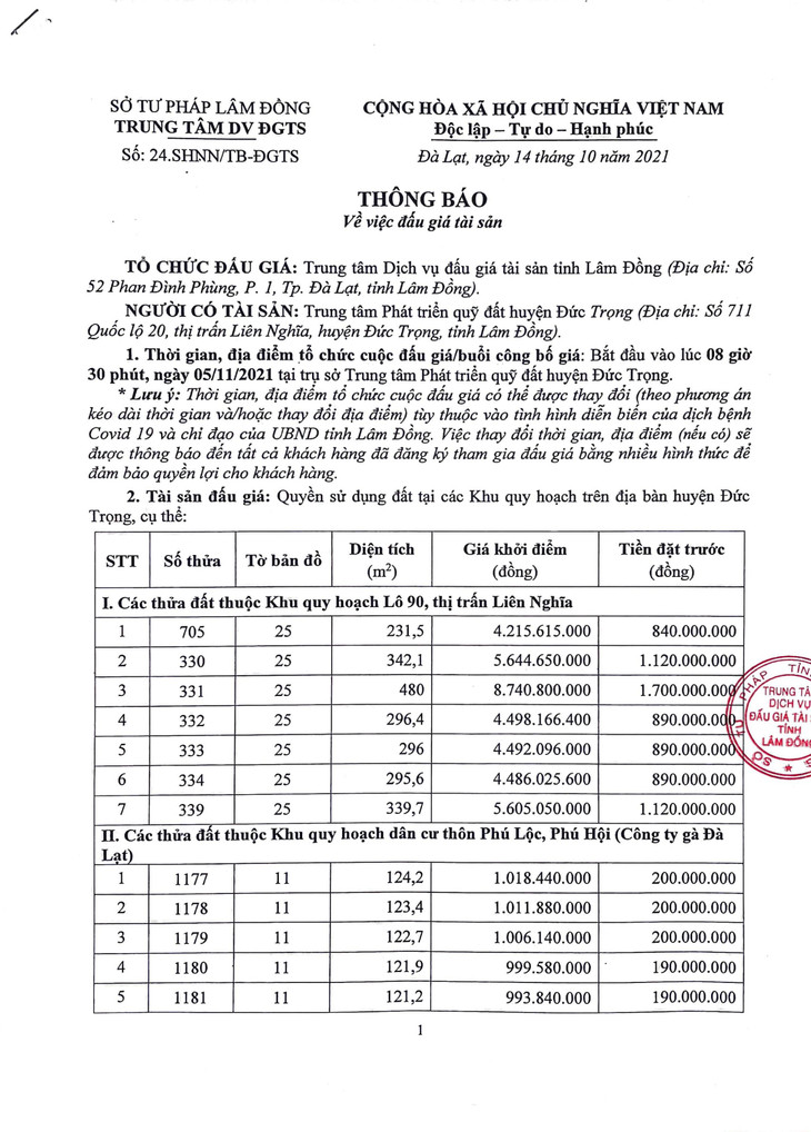 (BĐT) - Trung tâm Dịch vụ Đấu giá tài sản tỉnh Lâm Đồng thông báo đấu giá tài sản vào ngày 5/11/2021 do Trung tâm Phát triển quỹ đất huyện Đức Trọng ủy quyền như sau: