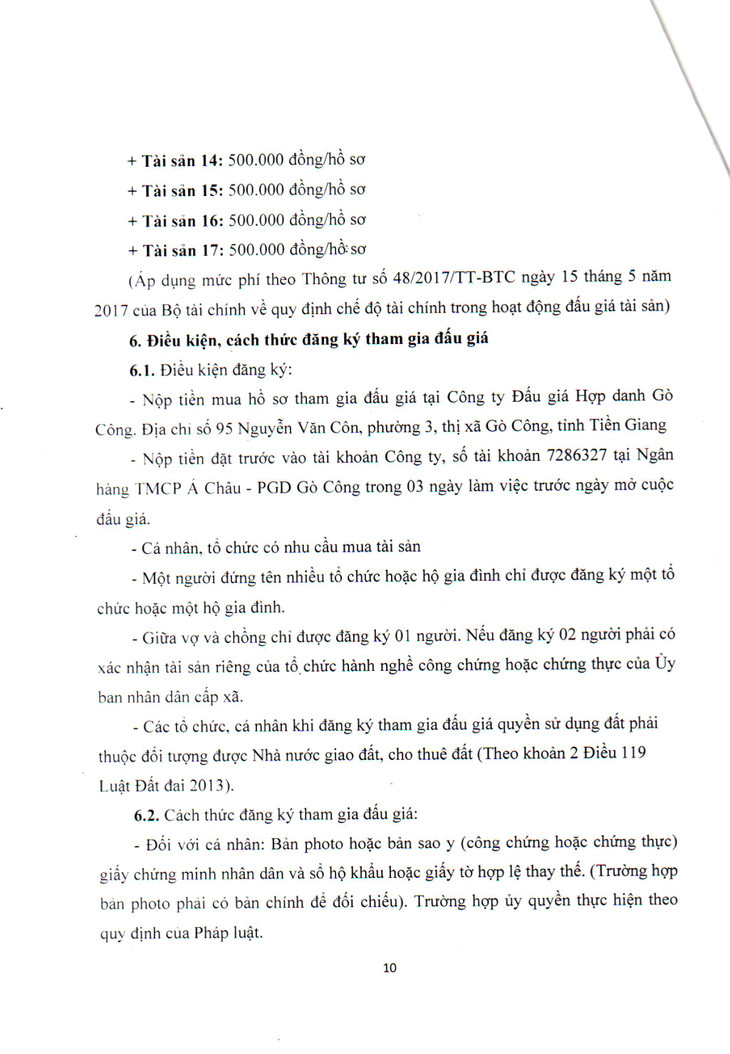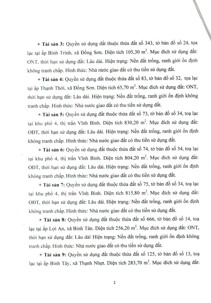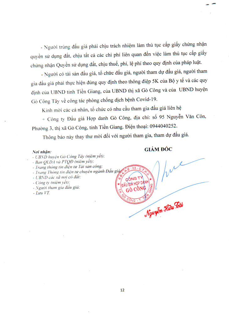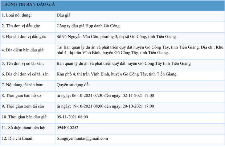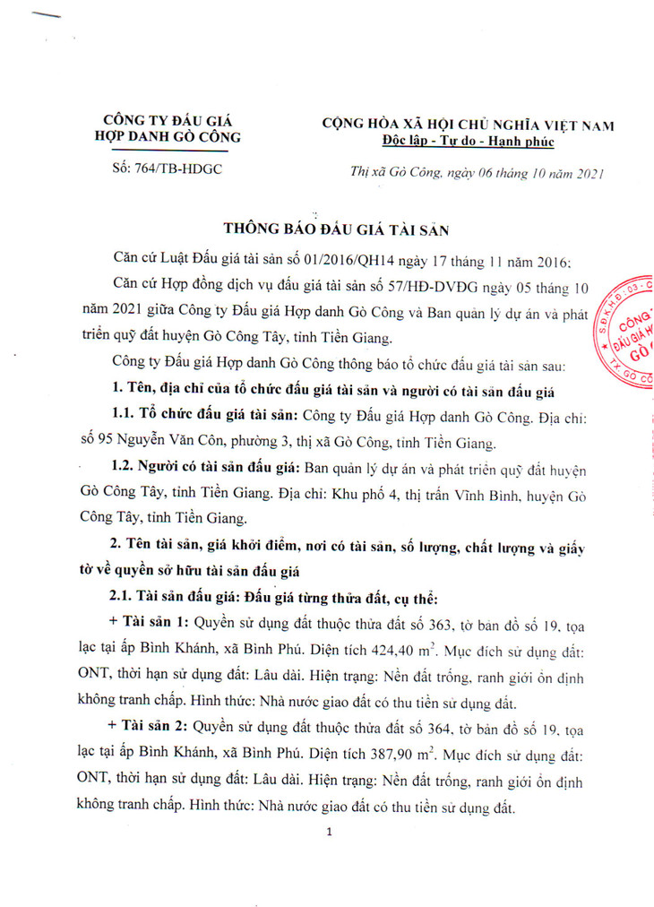(BĐT) - Công ty Đấu giá hợp danh Gò Công thông báo đấu giá tài sản vào ngày 5/11/2021 do Ban quản lý dự án và phát triển quỹ đất huyện Gò Công Tây, tỉnh Tiền Giang ủy quyền như sau: