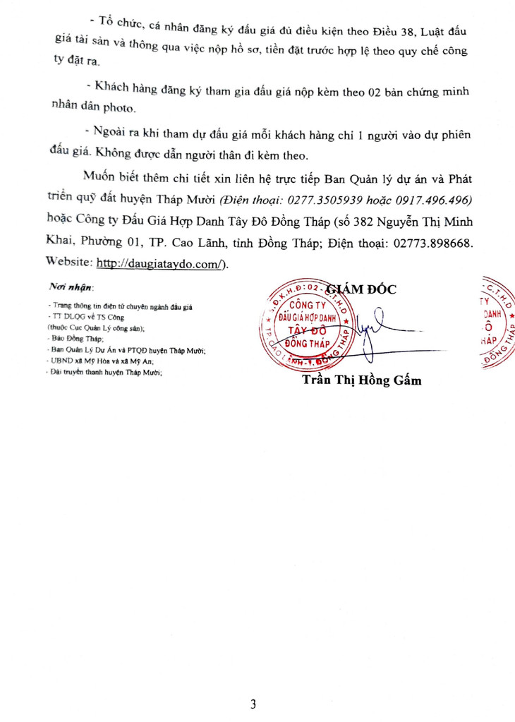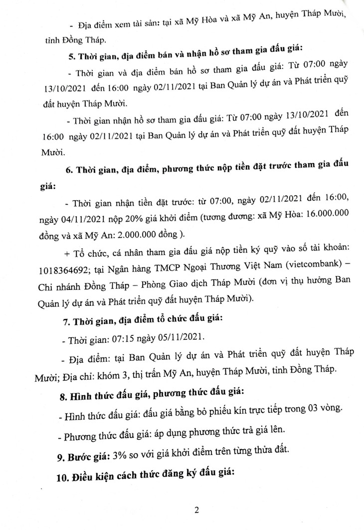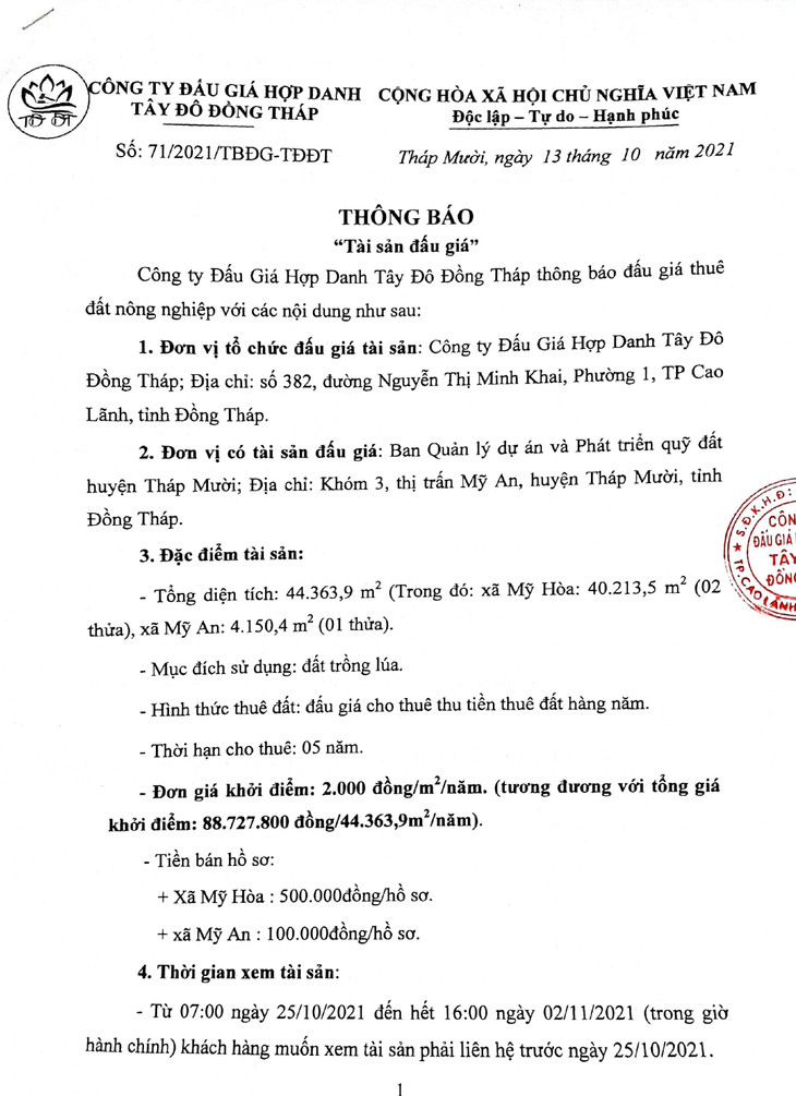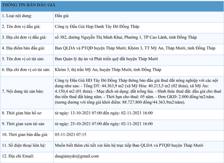 (BĐT) - Công ty Đấu giá hợp danh Tây Đô Đồng Tháp thông báo đấu giá tài sản vào ngày 5/11/2021 do Ban Quản lý dự án và Phát triển quỹ đất huyện Tháp Mười ủy quyền như sau: