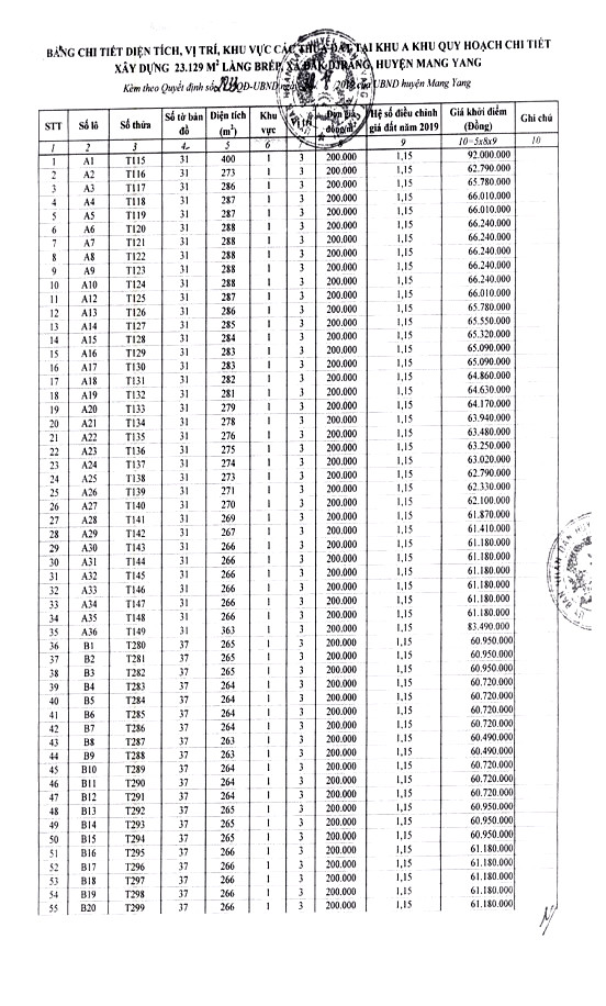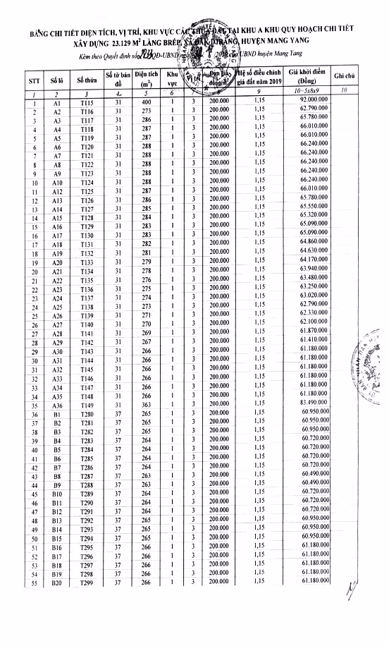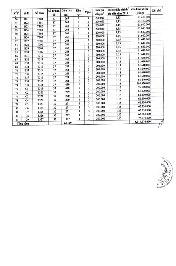 - Quyền sử dụng đất tại xã Đak Djrăng, huyện Mang Yang: 83 lô; Tổng diện tích: 23.129 m2; Tổng giá khởi điểm: 5.319.670.000 đồng.