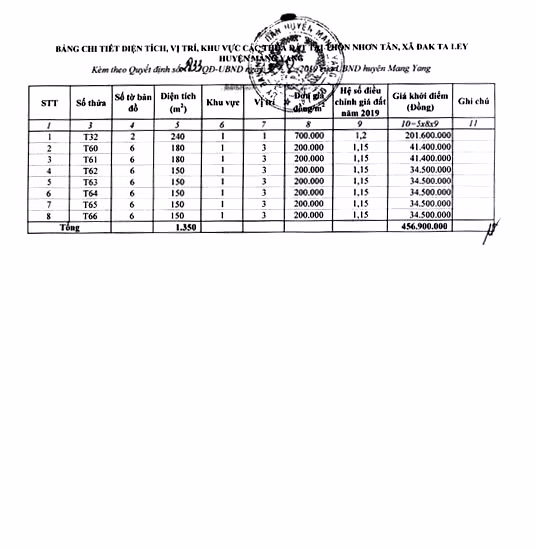 - Quyền sử dụng đất tại xã Đak Ta Ley, huyện Mang Yang: 08 lô; Tổng diện tích: 1.350 m2; Tổng giá khởi điểm: 456.900.000 đồng.