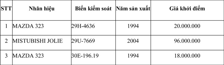 1. Tài sản đấu giá là: Tài sản là 03 chiếc ô tô đã qua sử dụng do xe đã cũ, xuống cấp và hư hỏng nặng của Công ty TNHH một thành viên Quản lý và phát triển nhà Hà Nội được thanh lý theo đúng quy định của pháp luật cụ thể là: