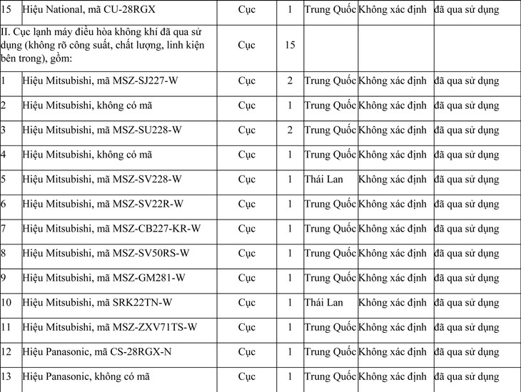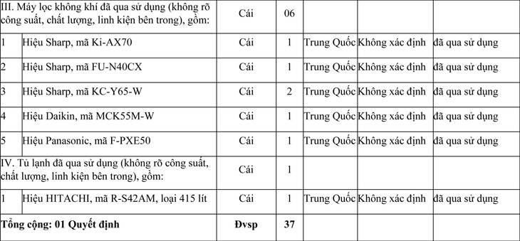 - Tên tài sản gồm 37 (Ba mươi bảy) đơn vị sản phẩm cục nóng, cục lạnh máy điều hòa không khí, máy lọc không khí và tủ lạnh do Trung Quốc sản xuất chi tiết như sau: