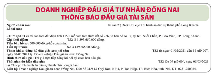(BĐT) - Doanh nghiệp đấu giá tư nhân Đồng Nai thông báo đấu giá tài sản vào ngày 5/3/2021 do Chi cục thi hành án dân sự thành phố Long Khánh ủy quyền như sau: