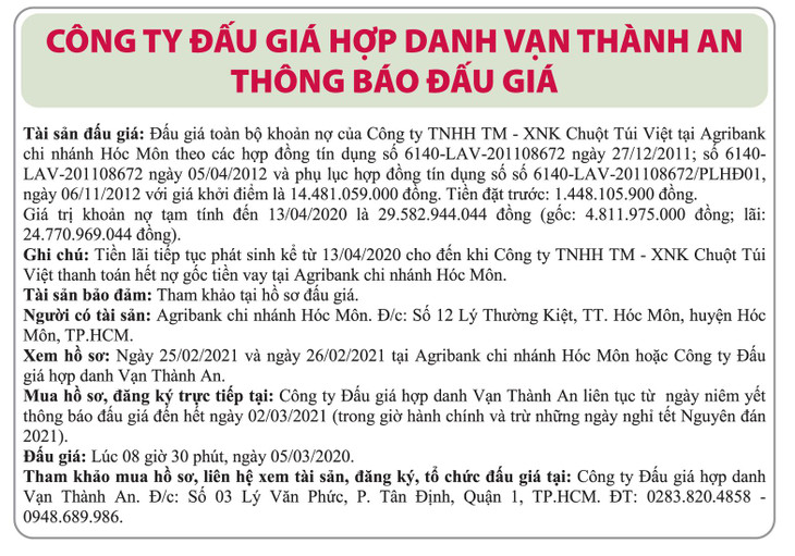 (BĐT) - Công ty Đấu giá hợp danh Vạn Thành An thông báo bán đấu giá toàn bộ khoản nợ của Công ty TNHH TM-XNK Chuột Túi Việt tại Agribank Chi nhánh Hóc Môn vào ngày 5/3/2021 như sau: