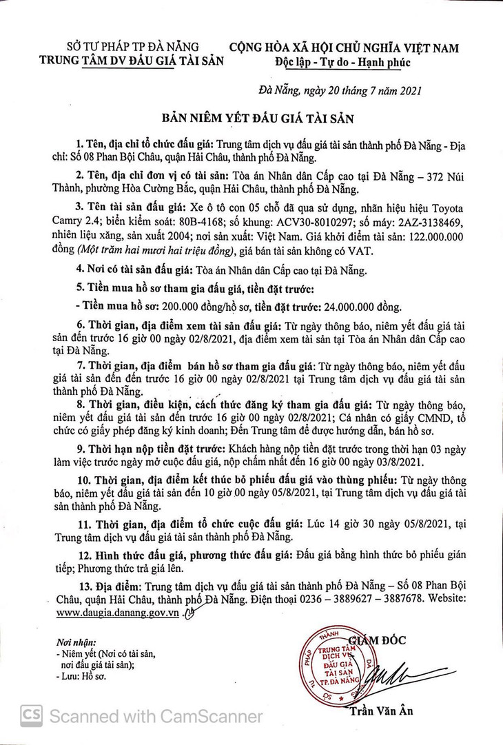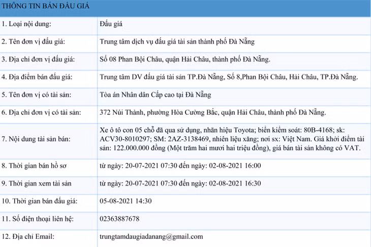 Xe ô tô con 05 chỗ đã qua sử dụng, nhãn hiệu hiệu Toyota; biển kiểm soát: 80B-4168; số khung: ACV30-8010297; số máy: 2AZ-3138469, nhiên liệu xăng; nơi sản xuất: Việt Nam. Giá khởi điểm tài sản: 122.000.000 đồng (Một trăm hai mươi hai triệu đồng), giá bán tài sản không có VAT.
