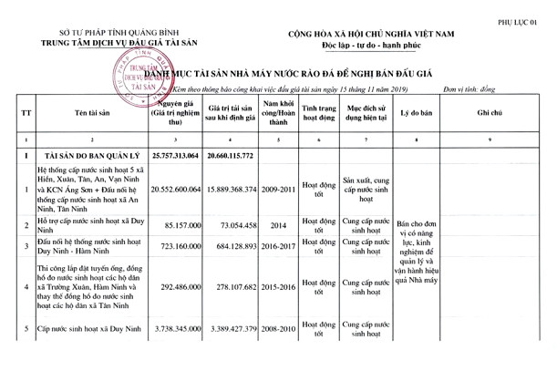 3. Tài sản đấu giá: Hệ thống Nhà máy nước Rào Đá do Ban Quản lý Dự án đầu tư xây dựng và phát triển Quỹ đất huyện Quảng Ninh quản lý, sử dụng.