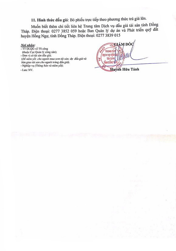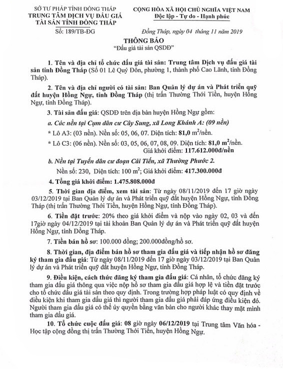 (BĐT) - Trung tâm dịch vụ đấu giá tài sản tỉnh Đồng Tháp thông báo bán đấu giá tài sản vào ngày 6/12/2019 do Ban Quản lý dự án và Phát triển quỹ đất huyện Hồng Ngự ủy quyền như sau:
