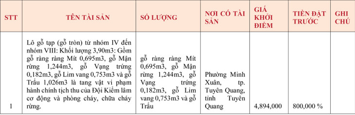 THÔNG BÁO VIỆC ĐẤU GIÁ ĐỐI VỚI DANH MỤC TÀI SẢN: LÔ GỖ TẠP (GỖ TRÒN) TỪ NHÓM IV ĐẾN NHÓM VIII: KHỐI LƯỢNG 3,90M3: GỒM GỖ RÀNG RÀNG MÍT 0,695M3, GỖ MẬN RỪNG 1,244M3, GỖ VẠNG TRỨNG 0,182M3, GỖ LIM VANG 0,753M3 VÀ GỖ TRẨU 1,026M3 LÀ TANG VẬT VI PHẠM HÀNH CHÍNH TỊCH THU CỦA ĐỘI KIỂM LÂM CƠ ĐỘNG VÀ PHÒN...
