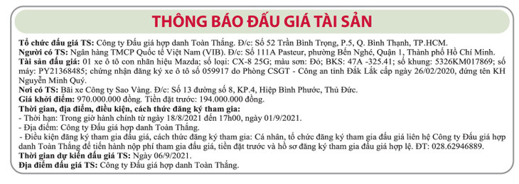 (BĐT) - Công ty Đấu giá hợp danh Toàn Thắng thông báo đấu giá tài sản vào ngày 6/9/2021 do Ngân hàng TMCP Quốc tế Việt Nam ủy quyền như sau: