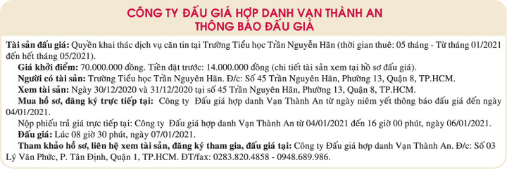 (BĐT) - Công ty Đấu giá hợp danh Vạn Thành An thông báo đấu giá tài sản vào ngày 7/1/2021 do Trường tiểu học Trần Nguyên Hãn, TPHCM ủy quyền như sau: