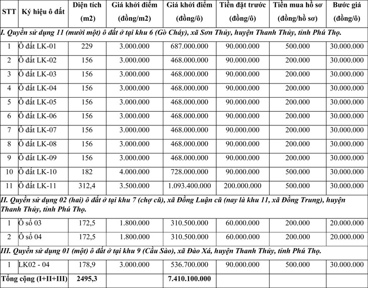 Quyền sử dụng 14 (mười bốn) ô đất ở nông thôn tại các xã Sơn Thủy, xã Đồng Trung và xã Đào Xá, huyện Thanh Thủy, tỉnh Phú Thọ. Cụ thể như sau: