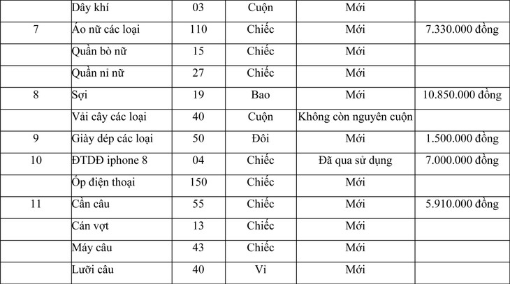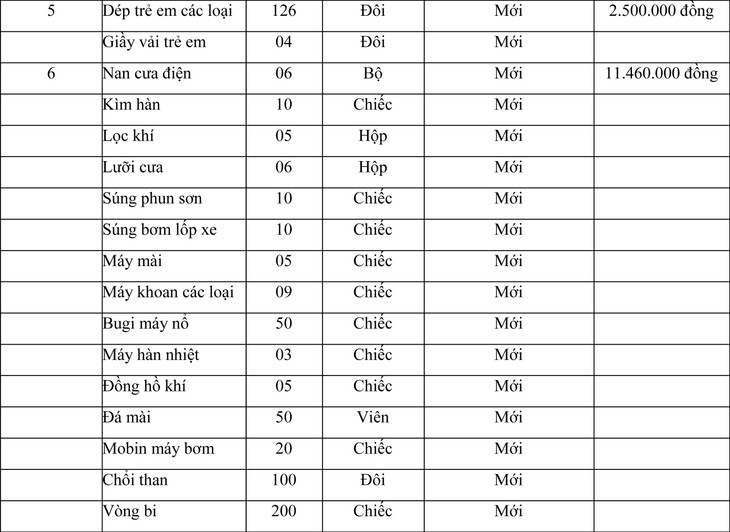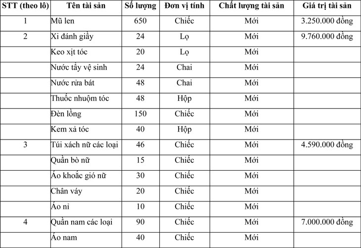 - Tên tài sản: Lô tài sản là hàng hóa tang vật vi phạm hành chính xử lý tịch thu sung công quỹ nhà nước (có danh mục chi tiết kèm theo thông báo này).