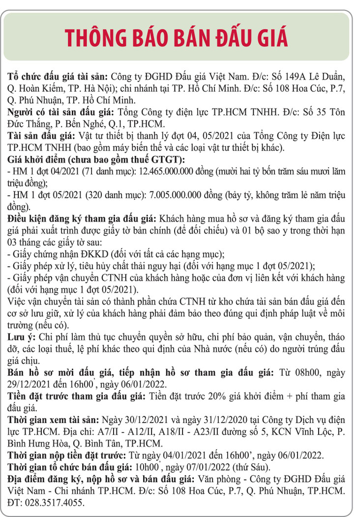 (BĐT) - Công ty Đấu giá hợp danh Đấu giá Việt Nam thông báo đấu giá tài sản vào ngày 7/1/2022 do Tổng Công ty điện lực TP.HCM TNHH ủy quyền như sau: