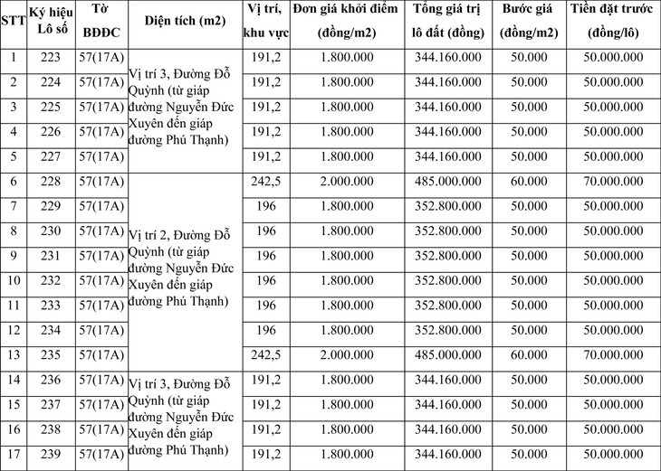 II. MỨC GIÁ KHỞI ĐIỂM, BƯỚC GIÁ, TIỀN ĐẶT TRƯỚC ĐỂ ĐẤU GIÁ QUYỀN SỬ DỤNG ĐẤT: