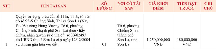 Địa điểm tổ chức cuộc đấu giá: Ngân hàng Nông nghiệp và Phát triển Nông thôn Việt Nam - Chi nhánh Thành phố Sơn La, địa chỉ: Số 09, đường Tô Hiệu, tổ 4, phường Tô Hiệu, thành phố Sơn La, tỉnh Sơn La.