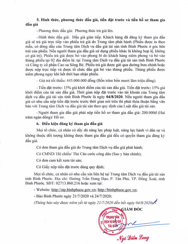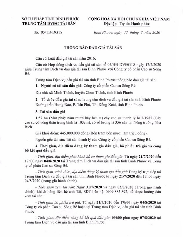 (BĐT) - Trung tâm dịch vụ đấu giá tài sản tỉnh Bình Phước thông báo bán đấu giá tài sản vào ngày 7/8/2020 do Công ty CP cao su Sông Bé ủy quyền như sau: