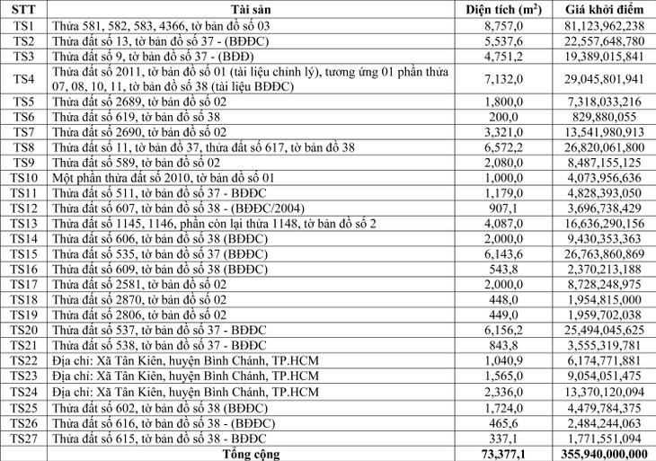 Giá khởi điểm: 355,940,000,000 đồng. Giá khởi điểm của từng tài sản cụ thể như sau: