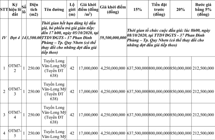 1. Tài sản đấu giá: Quyền sử dụng đất ở đối với 42 lô đất ở tại Khu đô thị mới Long Vân, phường Trần Quang Diệu, thành phố Quy Nhơn, với tổng diện tích là 8.680,00 m2, đất ở đô thị, thời hạn sử dụng đất: lâu dài, đất đã hoàn thiện hạn tầng kỹ thuật, không có tài sản trên đất và được tổ chức đấu giá theo 04 đợt đấu giá sau đây: