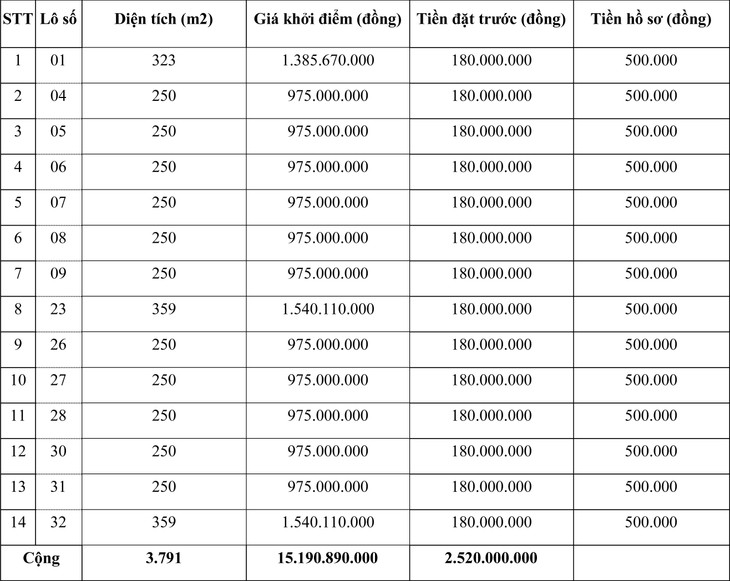 - Giá khởi điểm: Từ 975.000.000 đồng đến 1.540.110.000 đồng/lô đất;