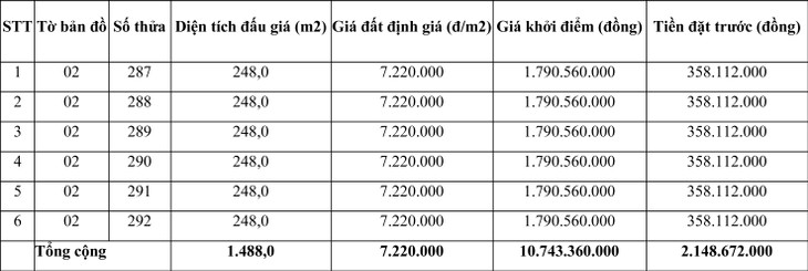 - Giá khởi điểm, tiền đặt trước (06 thửa đất): Cụ thể từng thửa như sau.