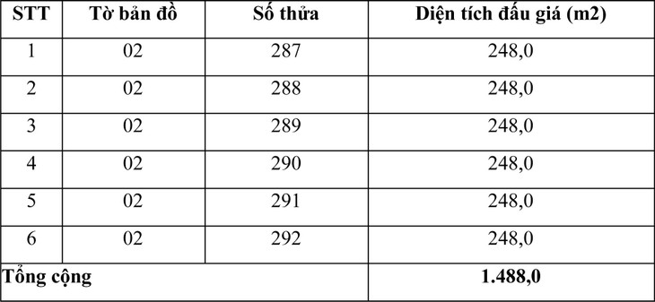 - Diện tích đấu giá: Cụ thể từng thửa như sau