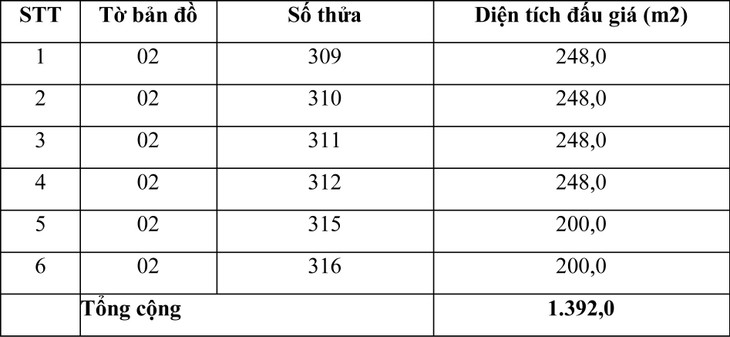 - Diện tích đấu giá: Cụ thể từng thửa như sau
