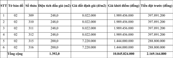 - Giá khởi điểm, tiền đặt trước (06 thửa đất): Cụ thể từng thửa như sau.