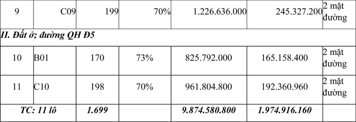 4. Thông tin về lô đất bán đấu giá quyền sử dụng đất: Tổng số lô đất đưa ra đấu giá: 11 lô đất ở (có danh sách chi tiết kèm theo).
