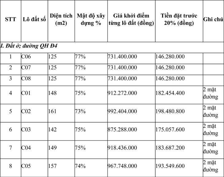 - Tiền đặt trước: 20% (Hai mươi phần trăm) giá khởi điểm của từng lô đất.