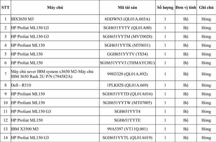 Tài sản bán đấu giá: Lô máy chủ của Bảo hiểm xã hội Thành phố Hồ Chí Minh (Gồm 18 bộ).