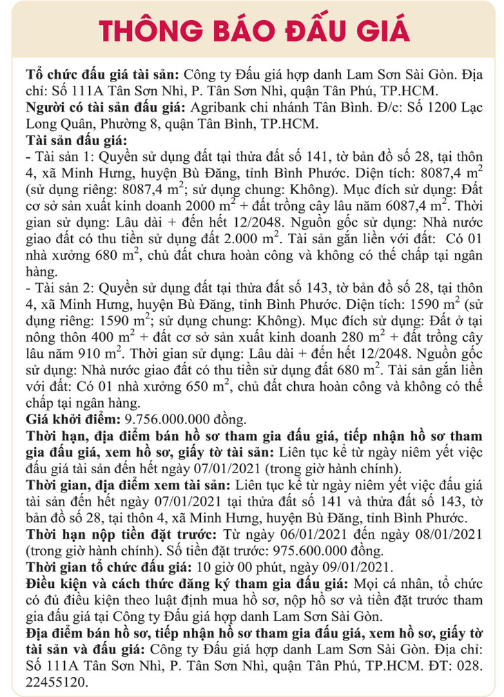 (BĐT) - Công ty Đấu giá hợp danh Lam Sơn Sài Gòn thông báo đấu giá tài sản vào ngày 9/1/2021 do Agribank Chi nhánh Tân Bình ủy quyền như sau:
