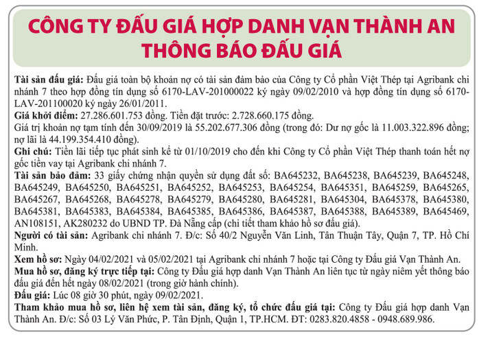 Ngày 30/12/2025, đấu giá khoản nợ của Công ty cổ phần An Đại Việt tại Agribank Chi nhánh TP. Hồ Chí Minh