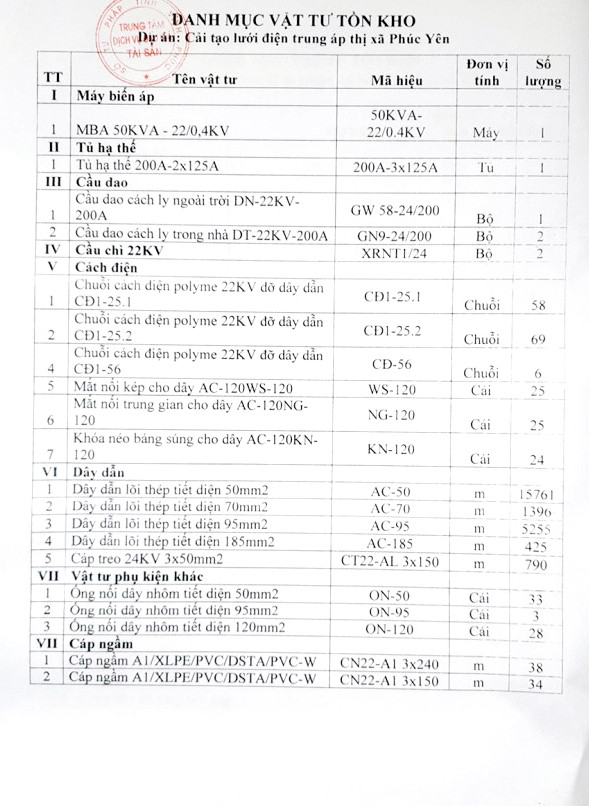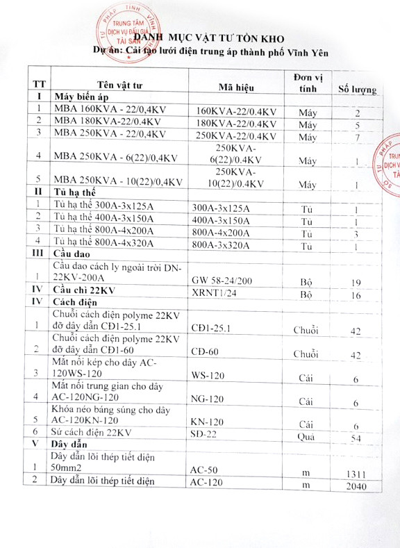 4. Tên tài sản, nơi có tài sản đấu giá; giá khởi điểm, tiền đặt trước, tiền mua hồ sơ tham gia đấu giá tài sản: Vật tư dư thừa dự án cải tạo lưới điện trung áp thành phố Vĩnh Yên và Phúc Yên (Chi tiết trong hồ sơ).