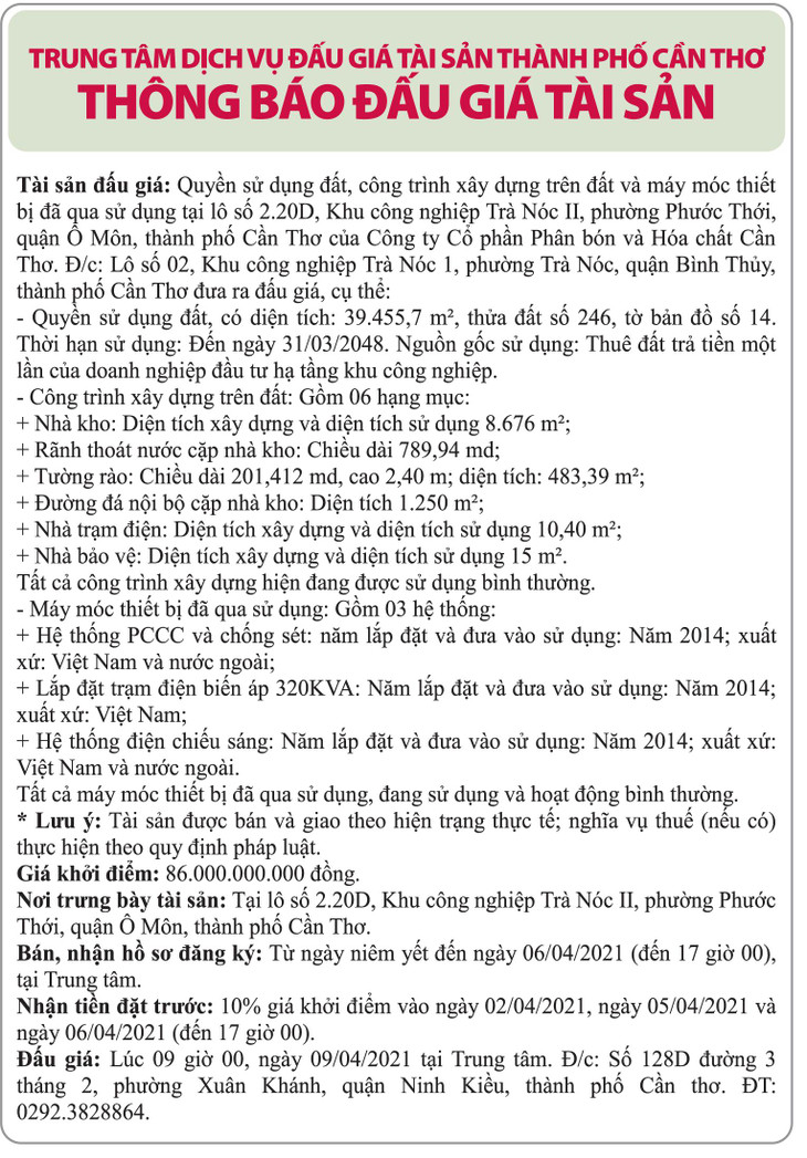 (BĐT) - Trung tâm Dịch vụ Đấu giá tài sản thành phố Cần Thơ thông báo đấu giá tài sản vào ngày 9/4/2021 như sau: