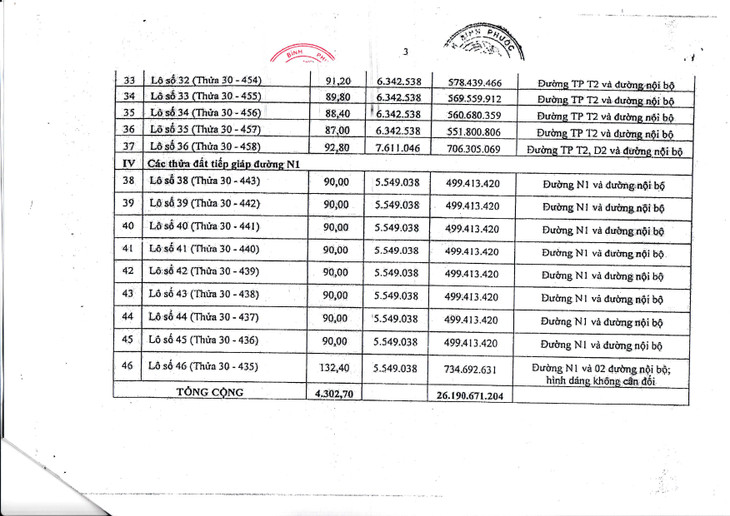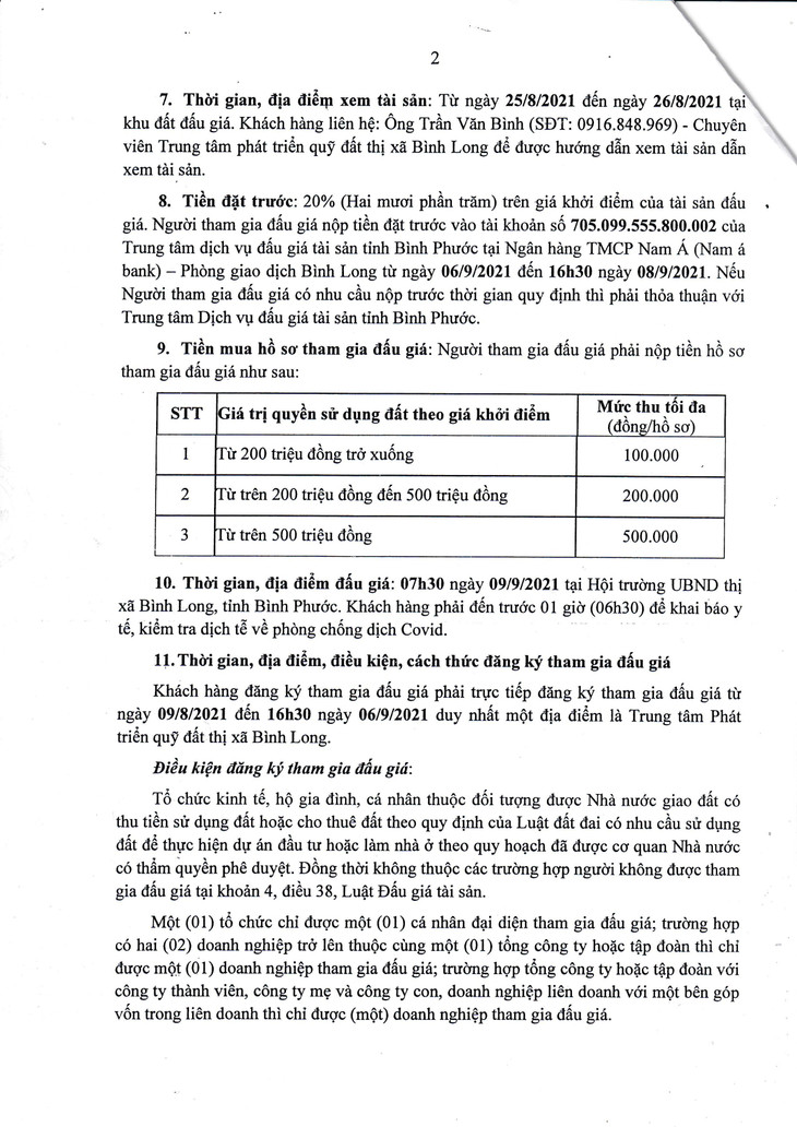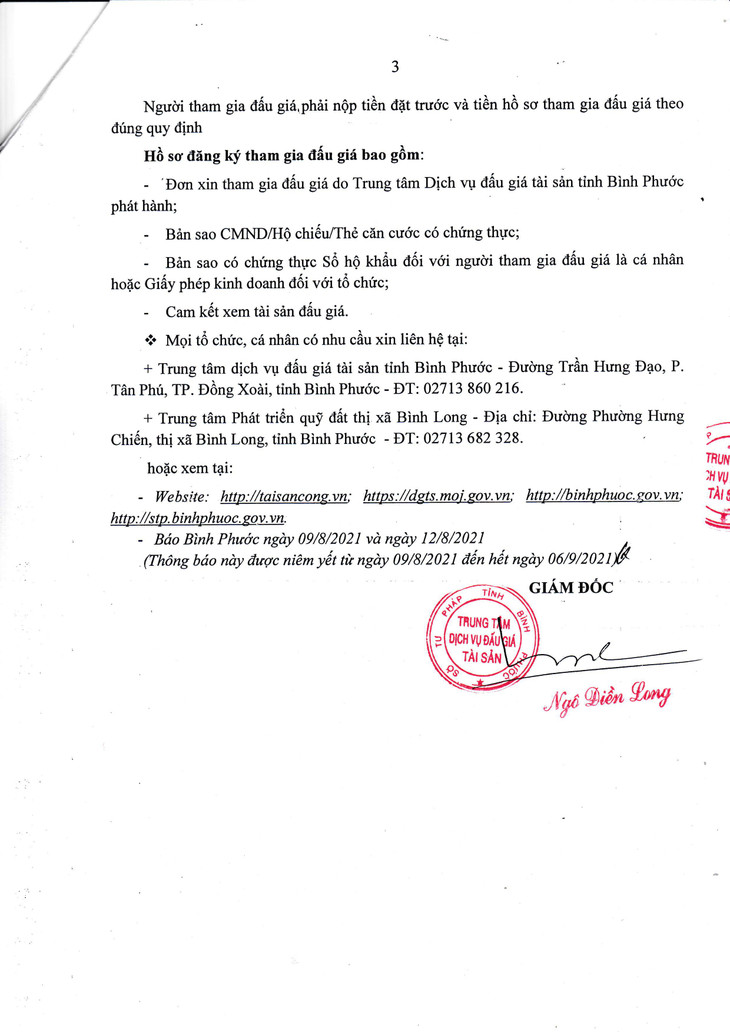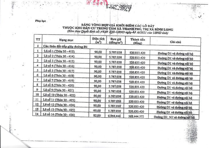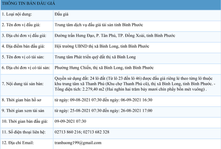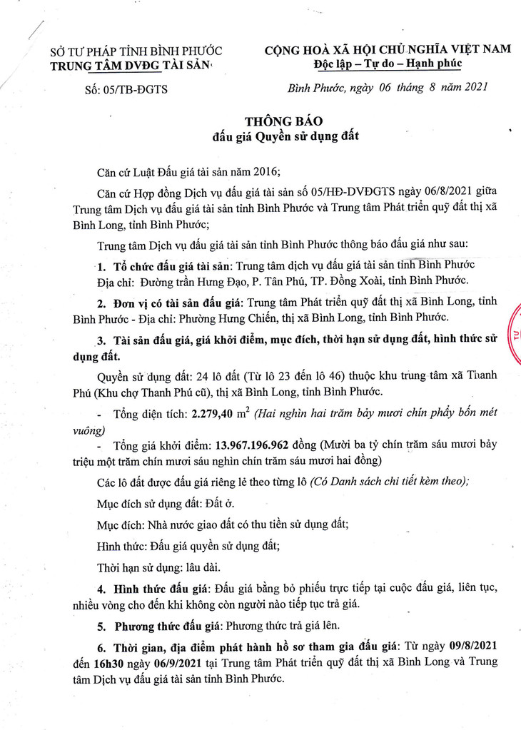 Quyền sử dụng đất: 24 lô đất (Từ lô 23 đến lô 46) được đấu giá riêng lẻ theo từng lô thuộc khu trung tâm xã Thanh Phú (Khu chợ Thanh Phú cũ), thị xã Bình Long, tỉnh Bình Phước. - Tổng diện tích: 2.279,40 m2 (Hai nghìn hai trăm bảy mươi chín phẩy bốn mét vuông).